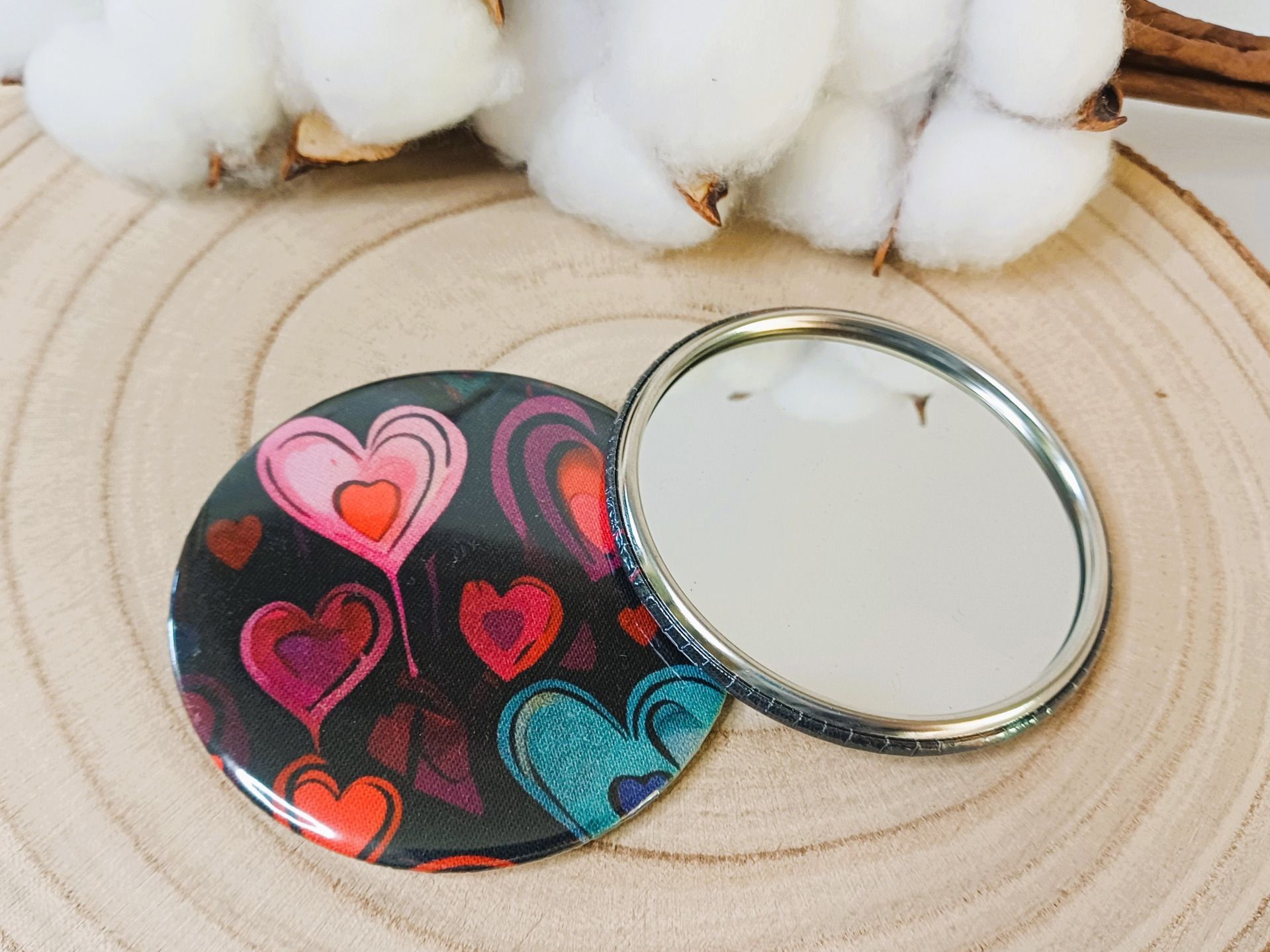 Miroir de sac avec au dos un tissu avec des coeurs ou un seul gros coeur au choix.