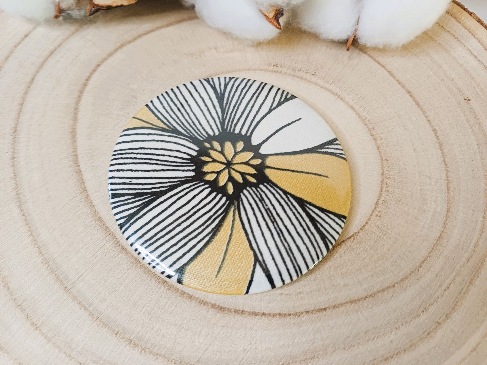 Miroir de sac avec dos un tissu à motif de fleur, tons noir & doré.