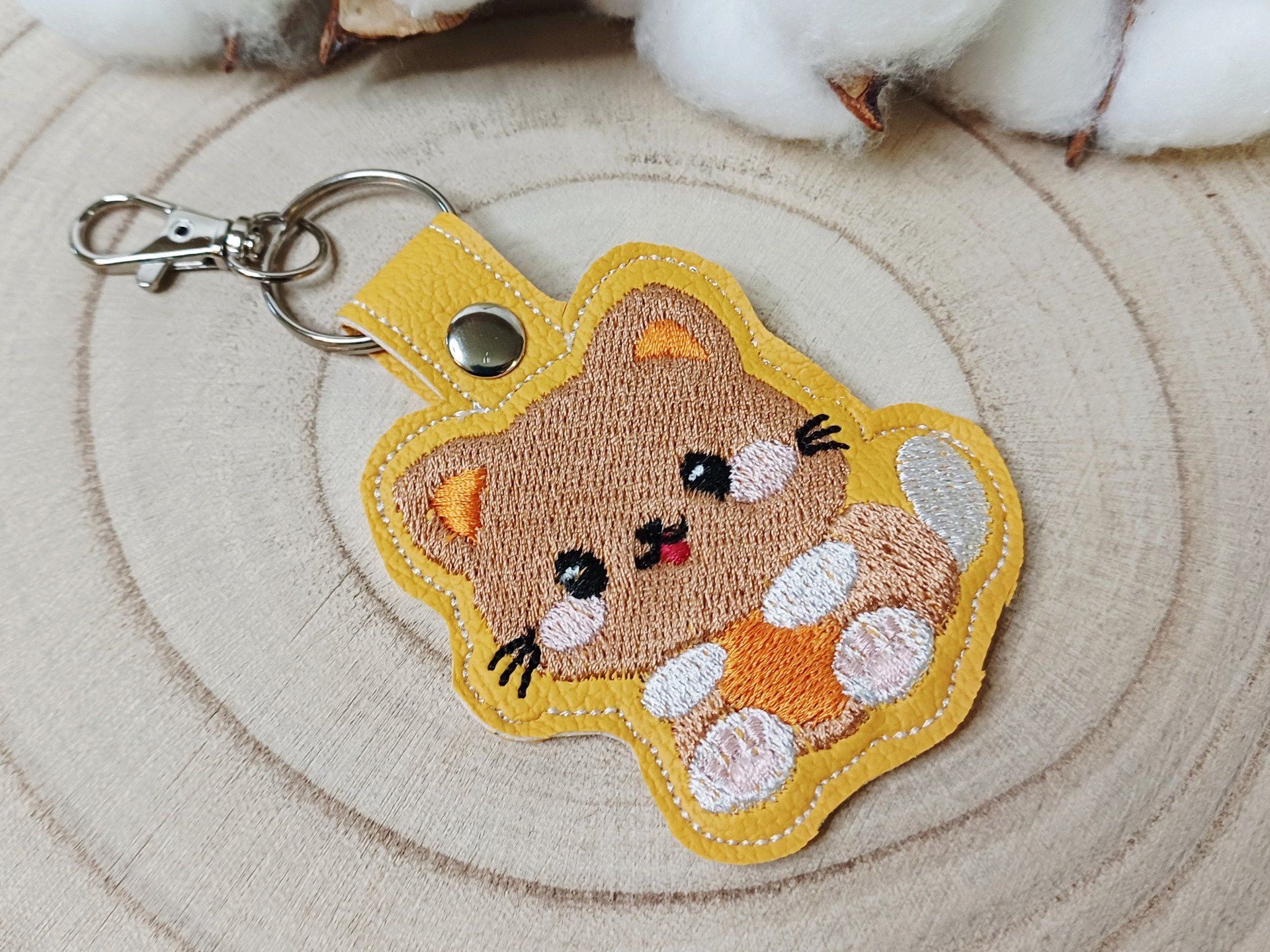 Ce porte-clé est en simili njaune ocre de qualité, avec un motif brodé dans des tons beige, roux et blanc.