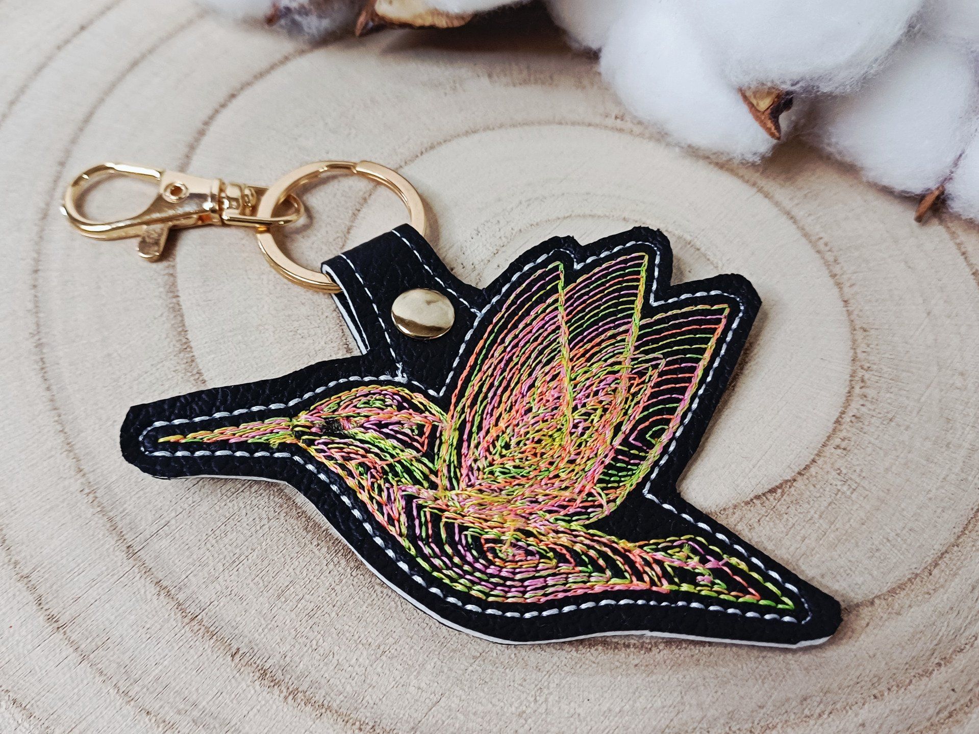 Ce porte-clé est en simili cuir noir de qualité et avec un motif de colibri brodé dans avec un fil multicolore.