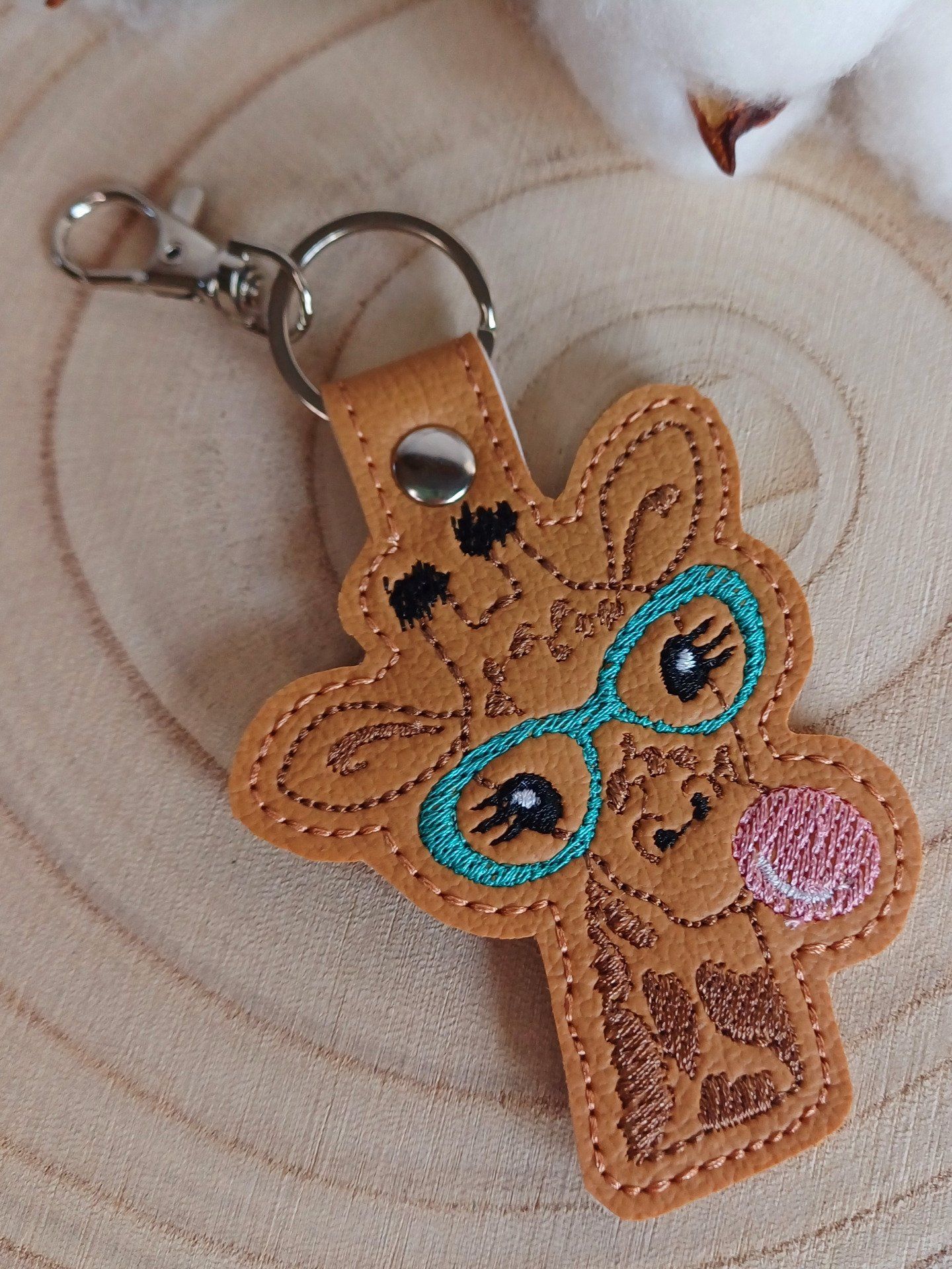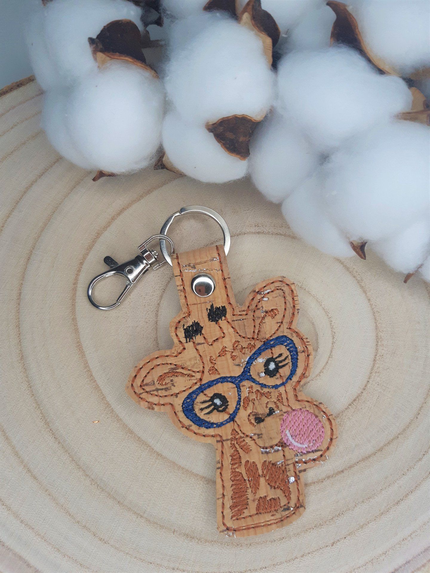 Un joli porte-clé brodé sur simili épais couleur, représentant une girafe à lunettes mâchant un chewing-gum.