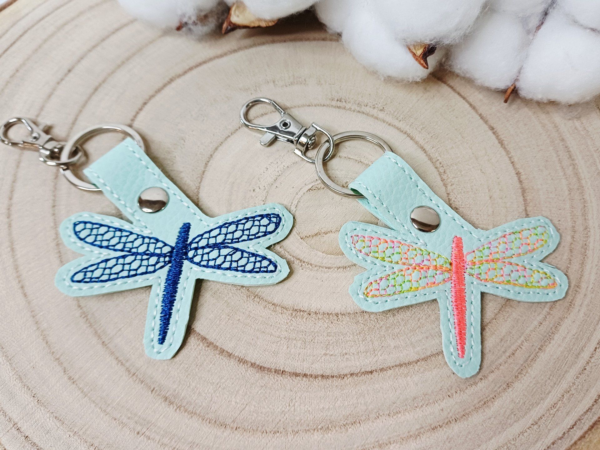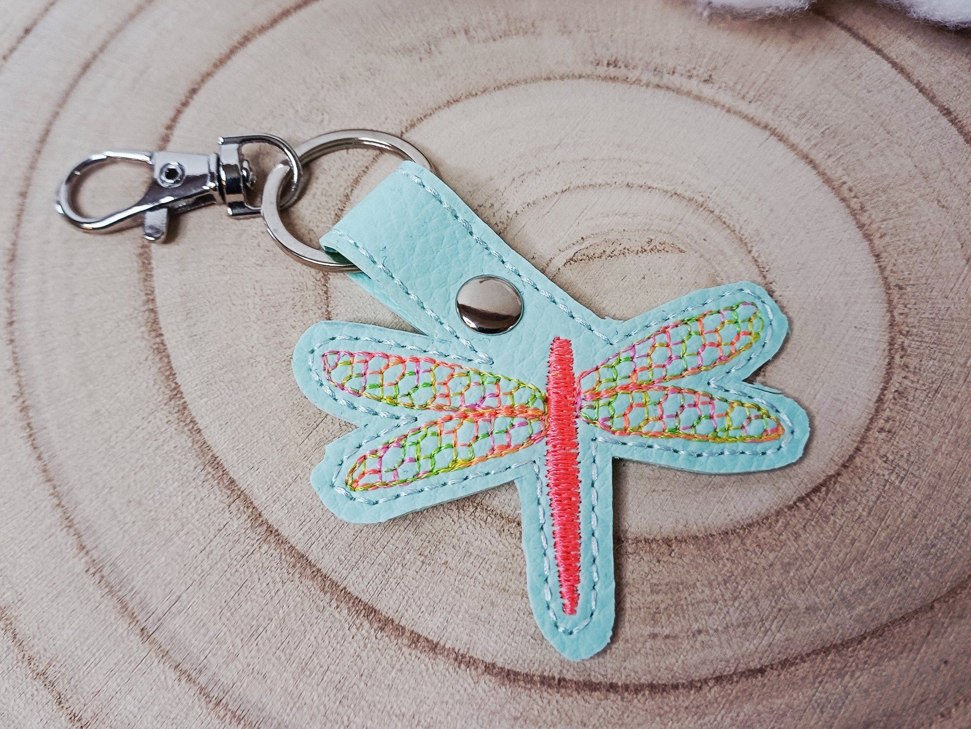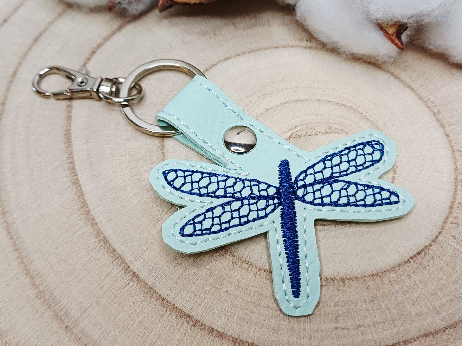 Ce porte-clé est en simili cuir turquoise très clair et avec un motif de libellule brodé.