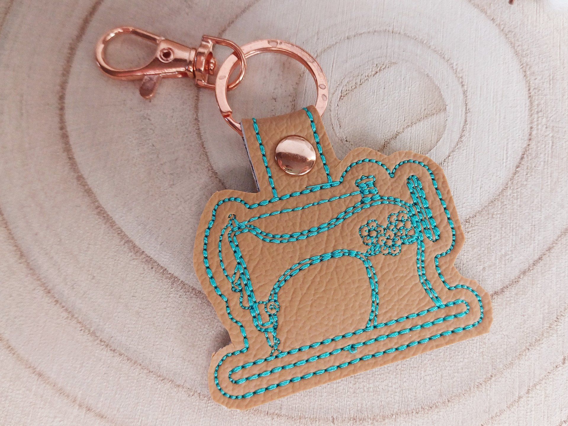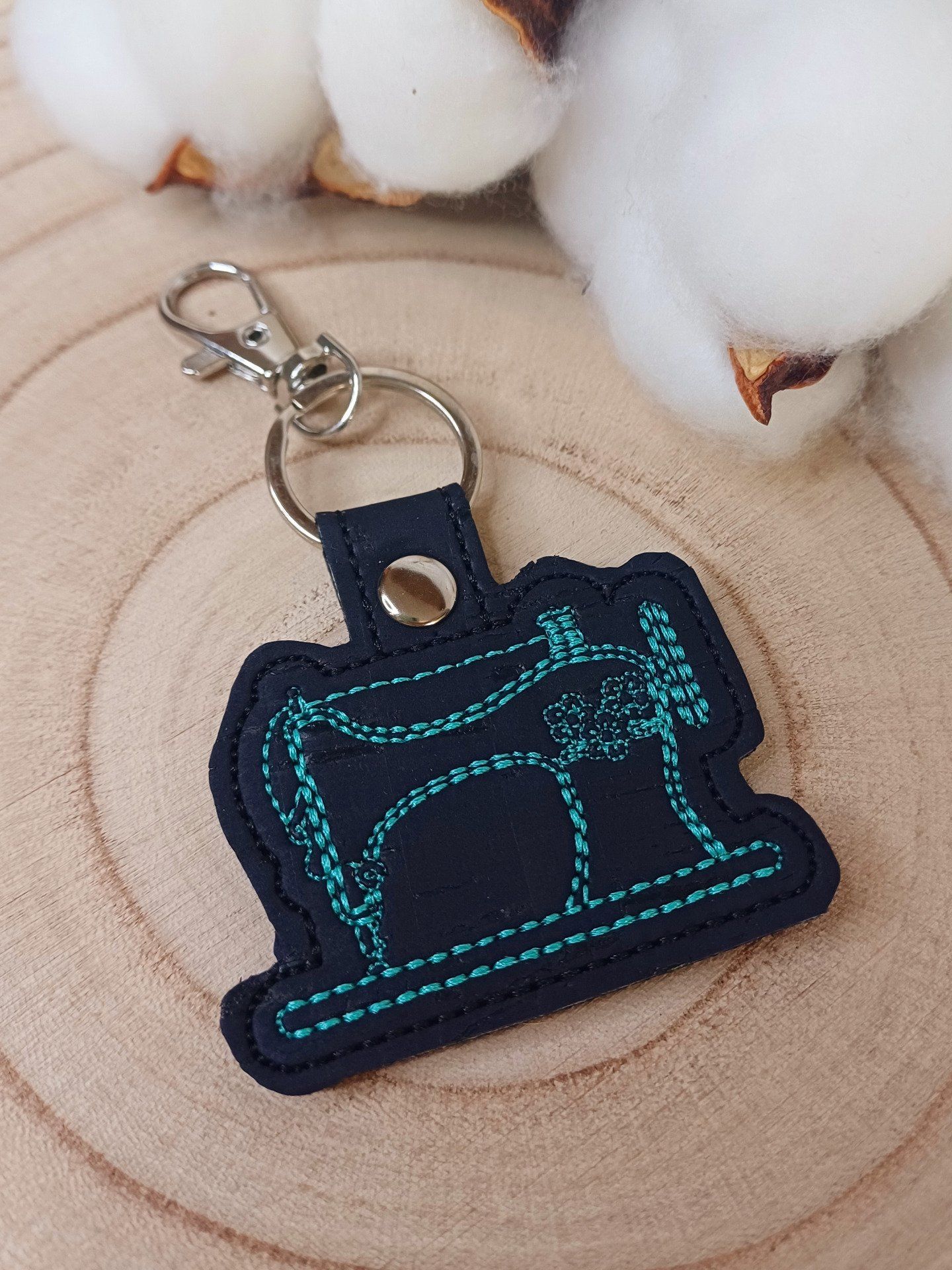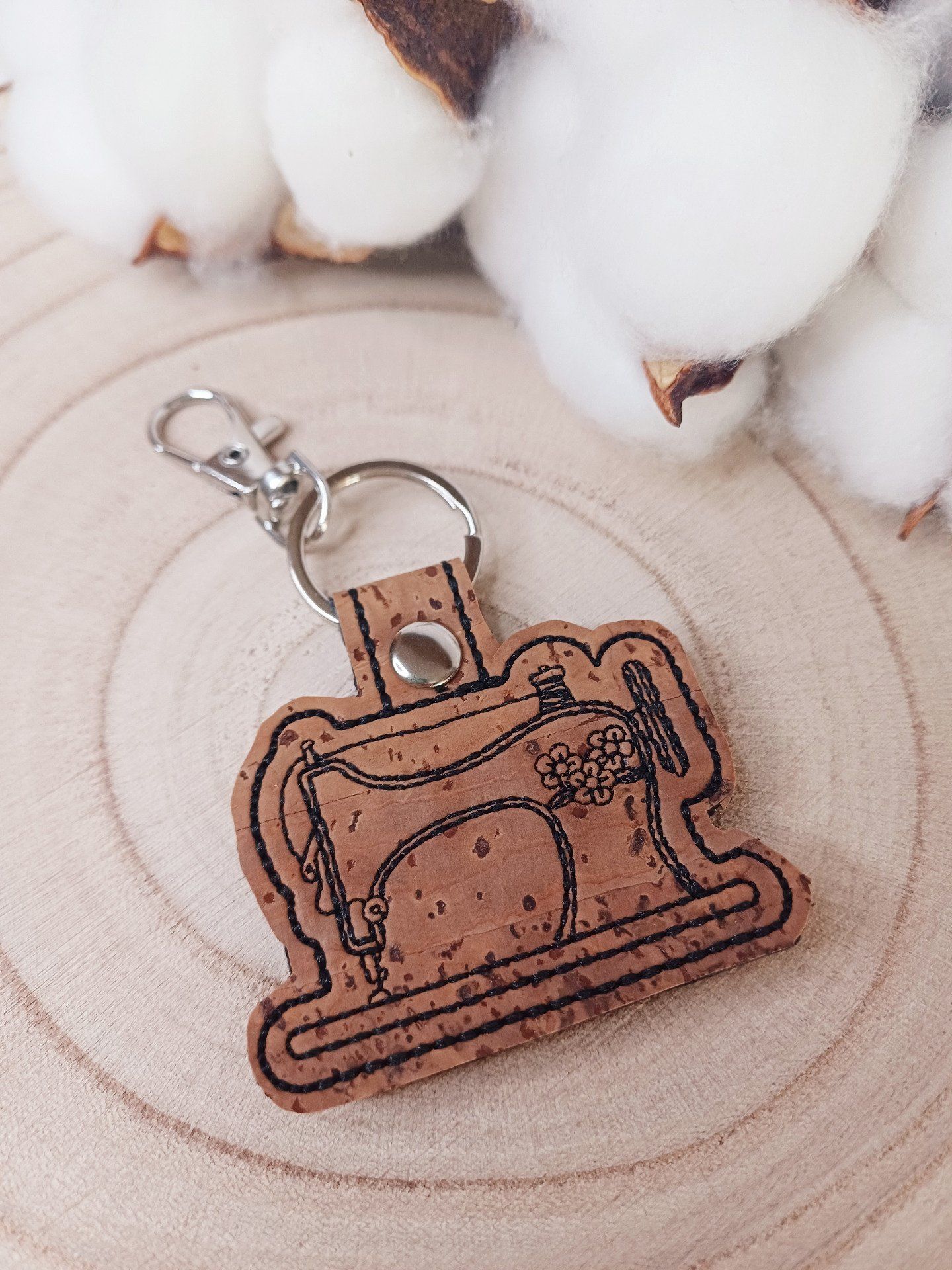 Porte-clé en liège avec son mousqueton et représentant une machine à coudre.