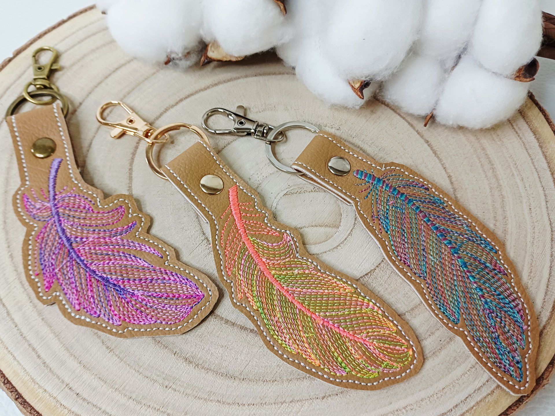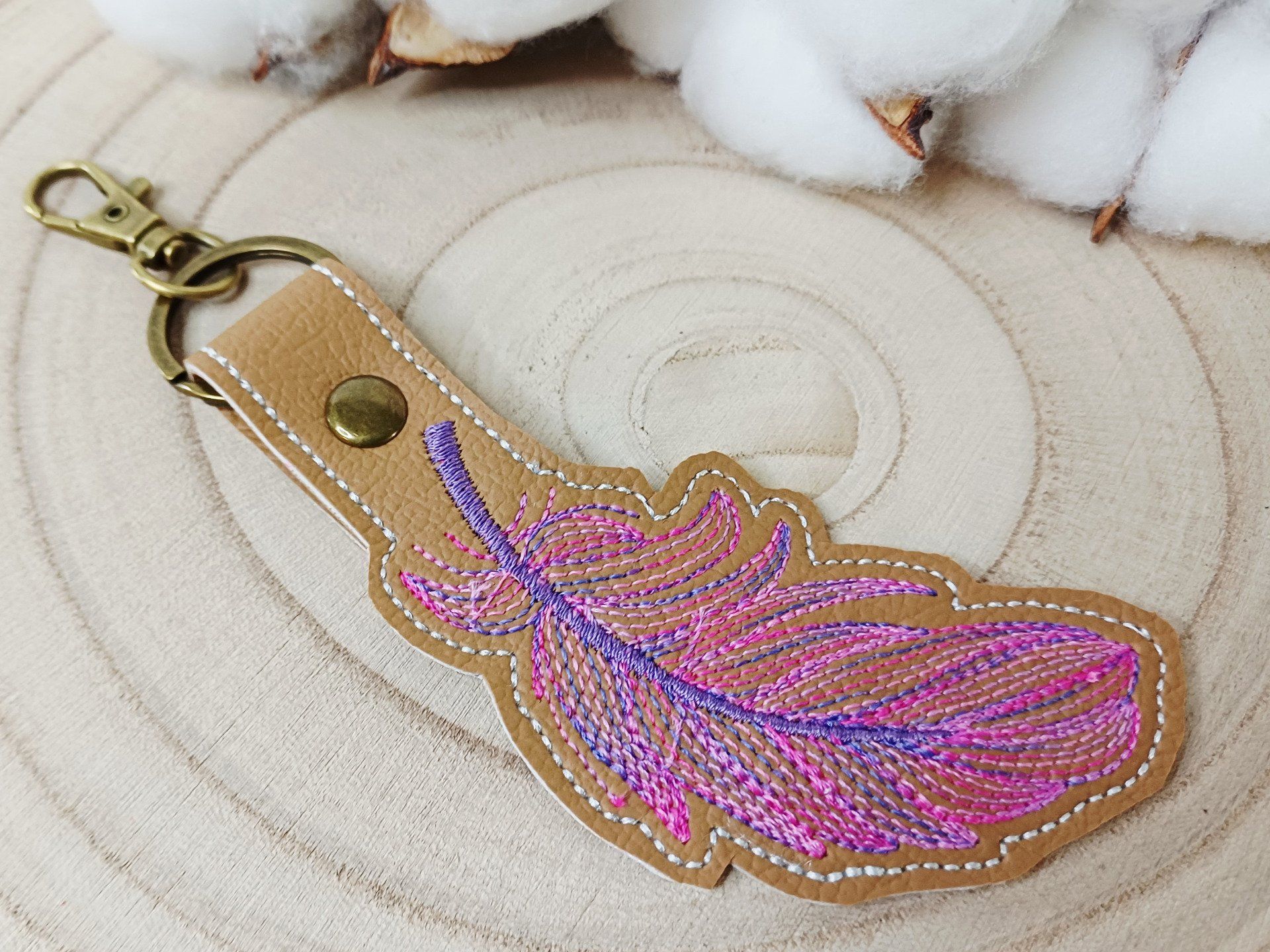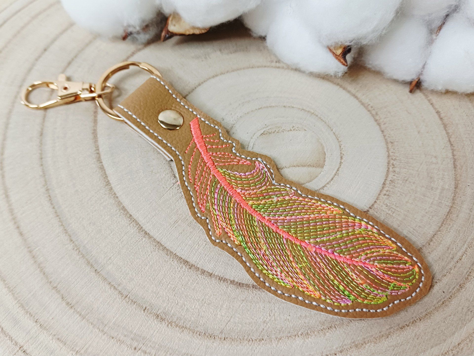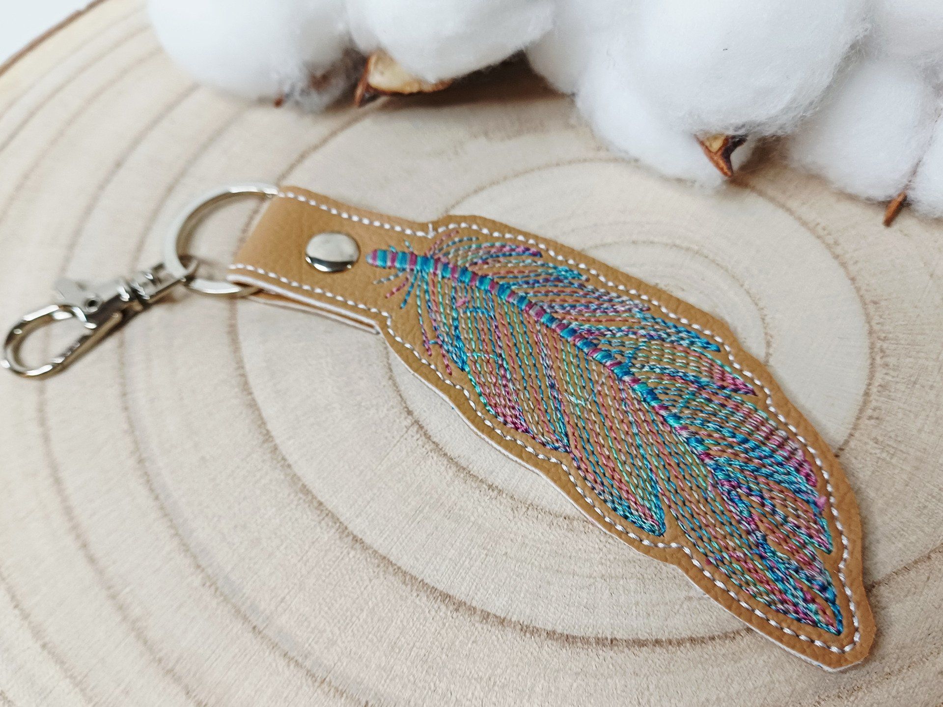 Ce porte-clé est en simili cuir beige camel de qualité et avec un motif de plume brodé dans différents tons.