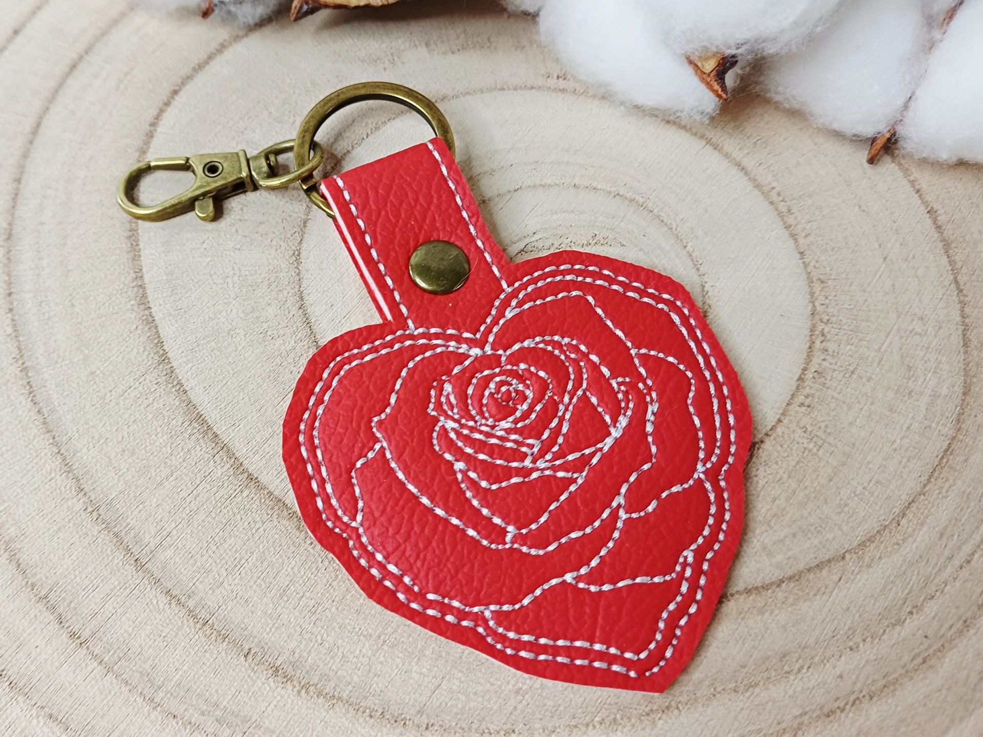 Porte-clé en simili cuir avec un motif de rose en forme de cœur.