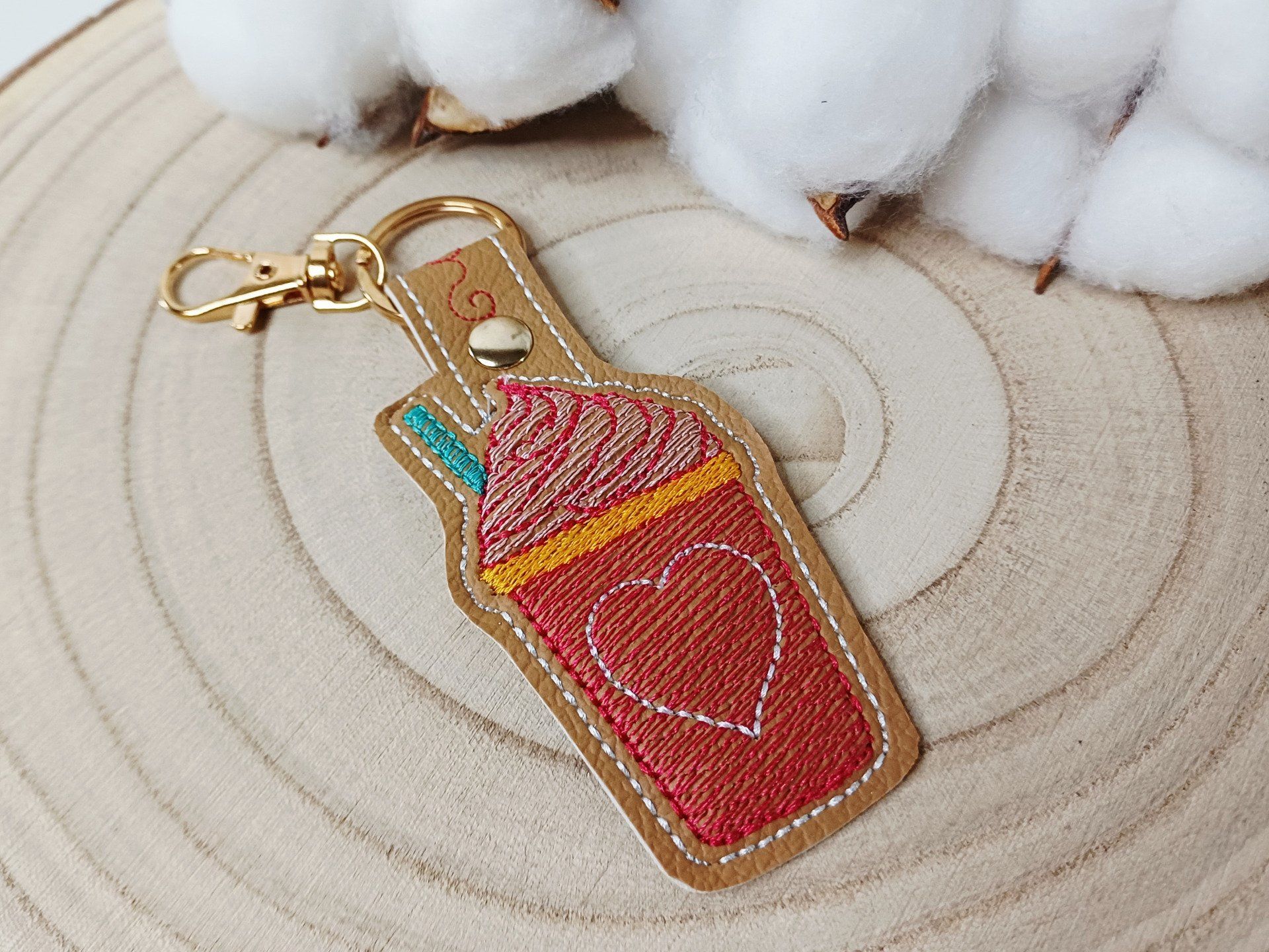 Porte-clé en simili cuir camel et représentant un smoothie.