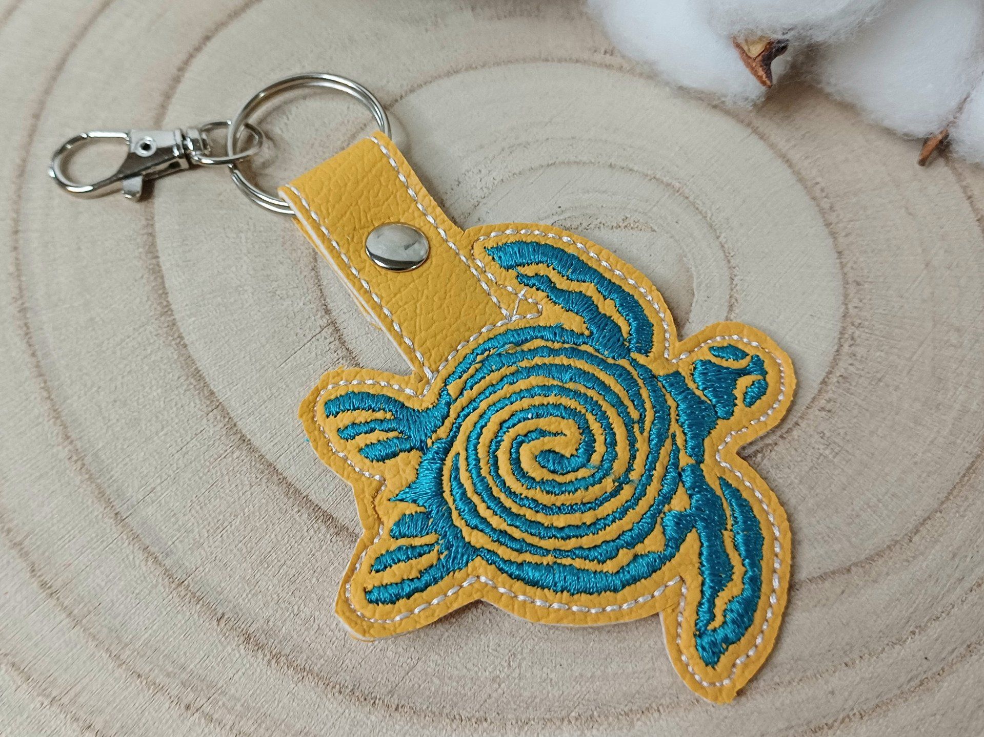 Ce porte-clé est en simili cuir jaune ocre de qualité et avec un motif de tortue brodé en turquoise.