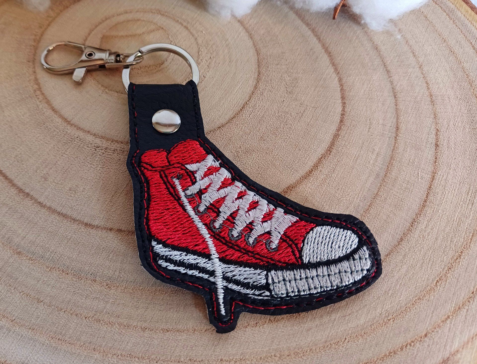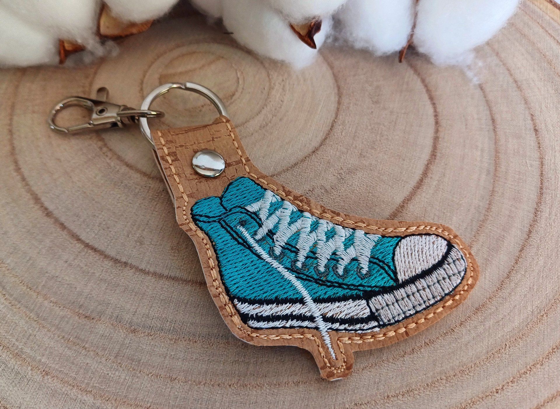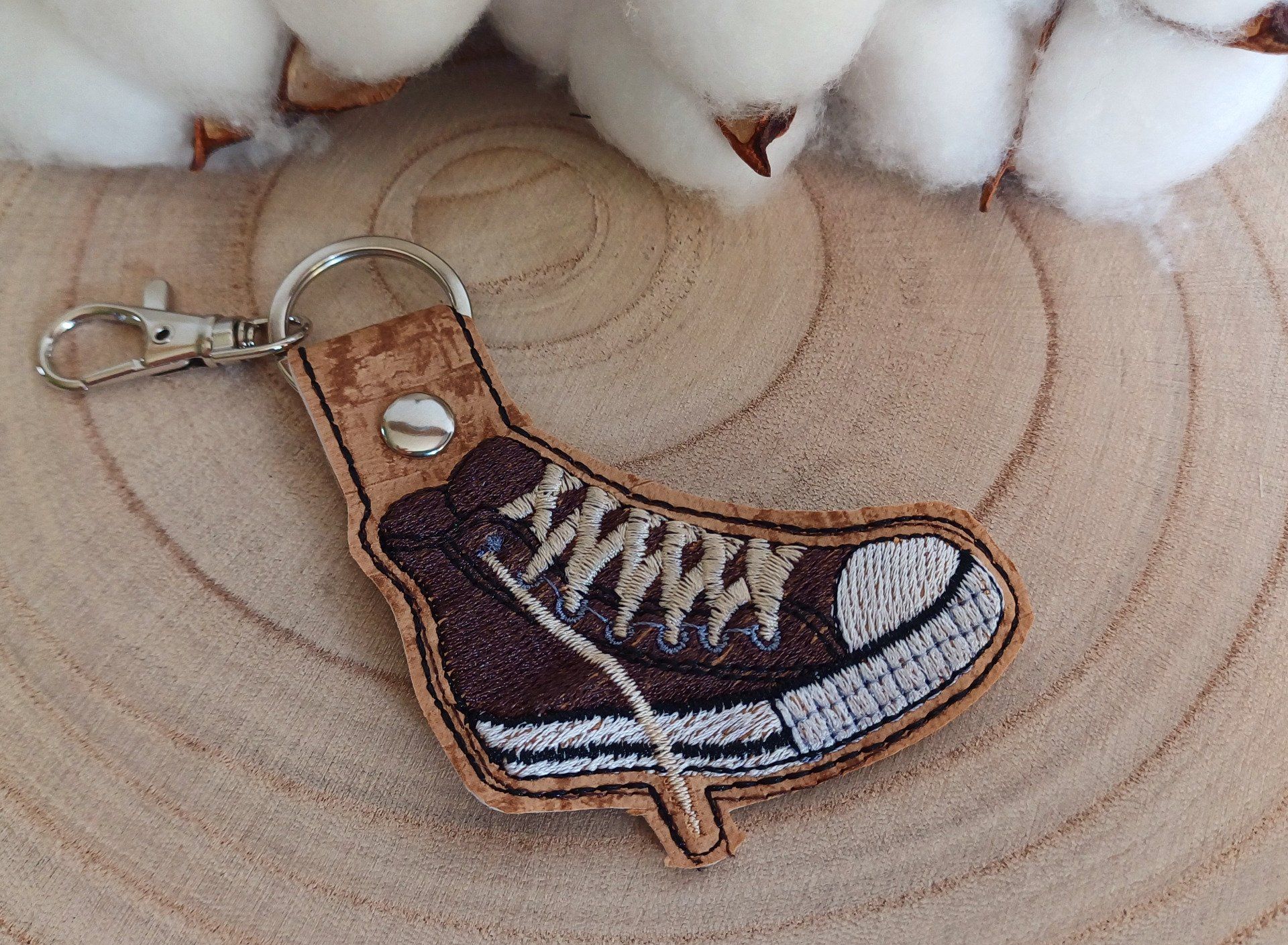Un joli porte-clé représentant une basket en toile. Il est en simili et le motif de la basket est brodé.
