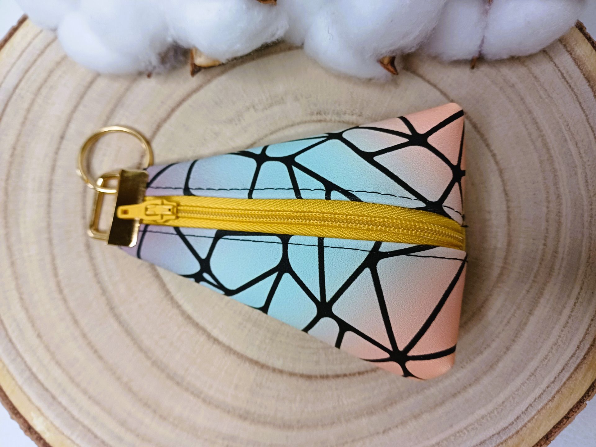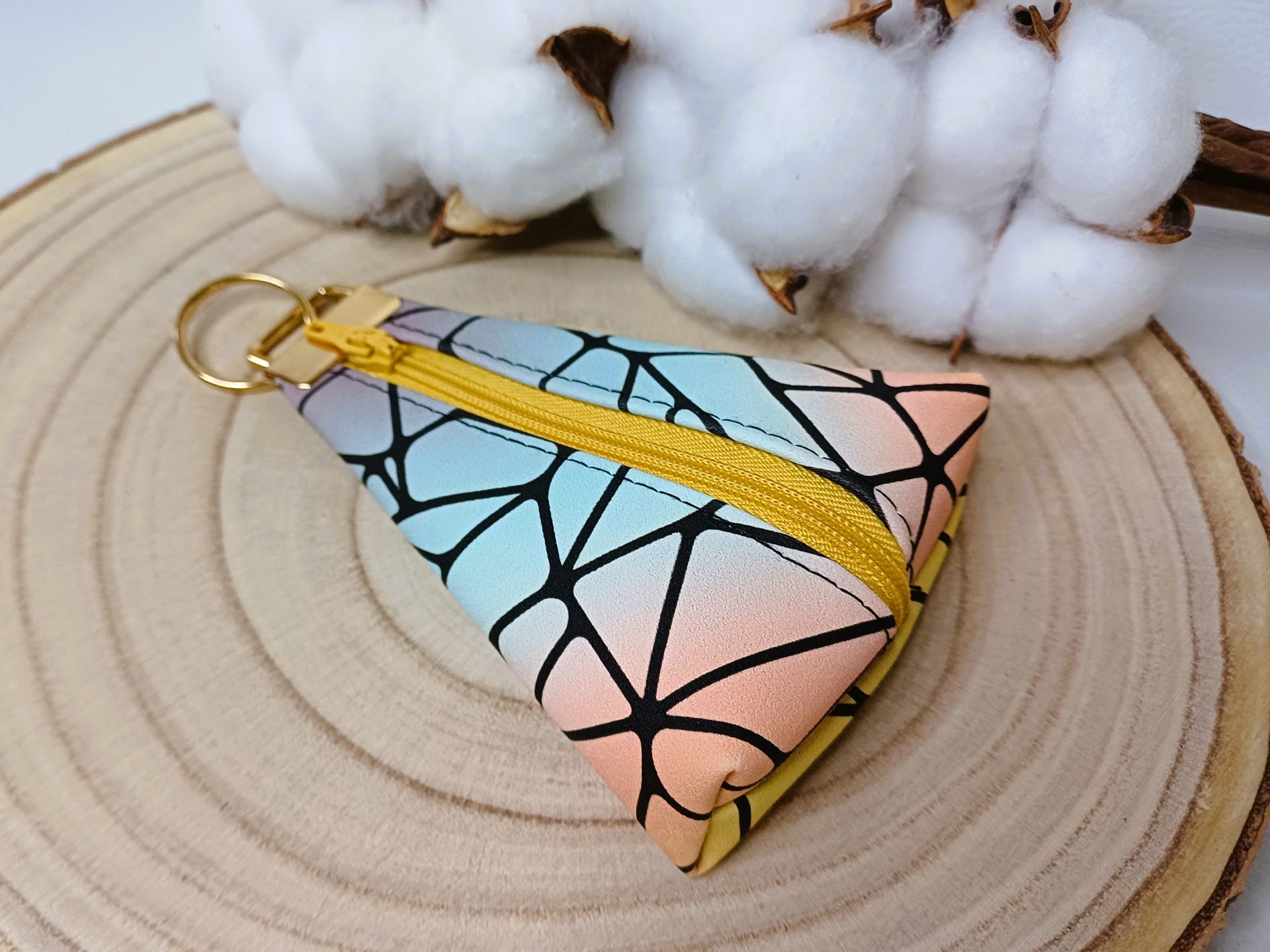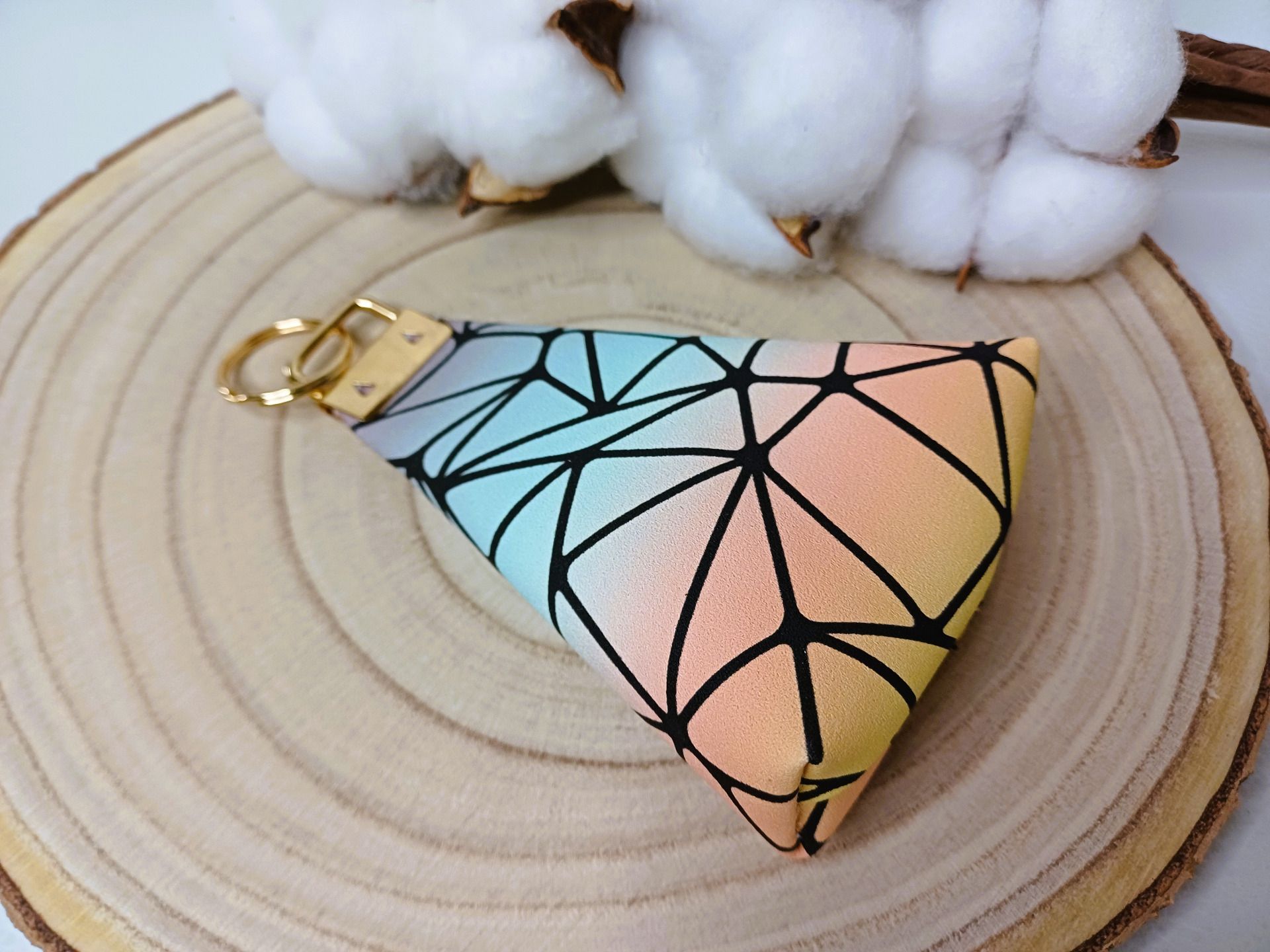 Porte-monnaie qui fait aussi porte-clés en simili turquoise, orange et jaune dégradés avec des traits géométriques noirs.
