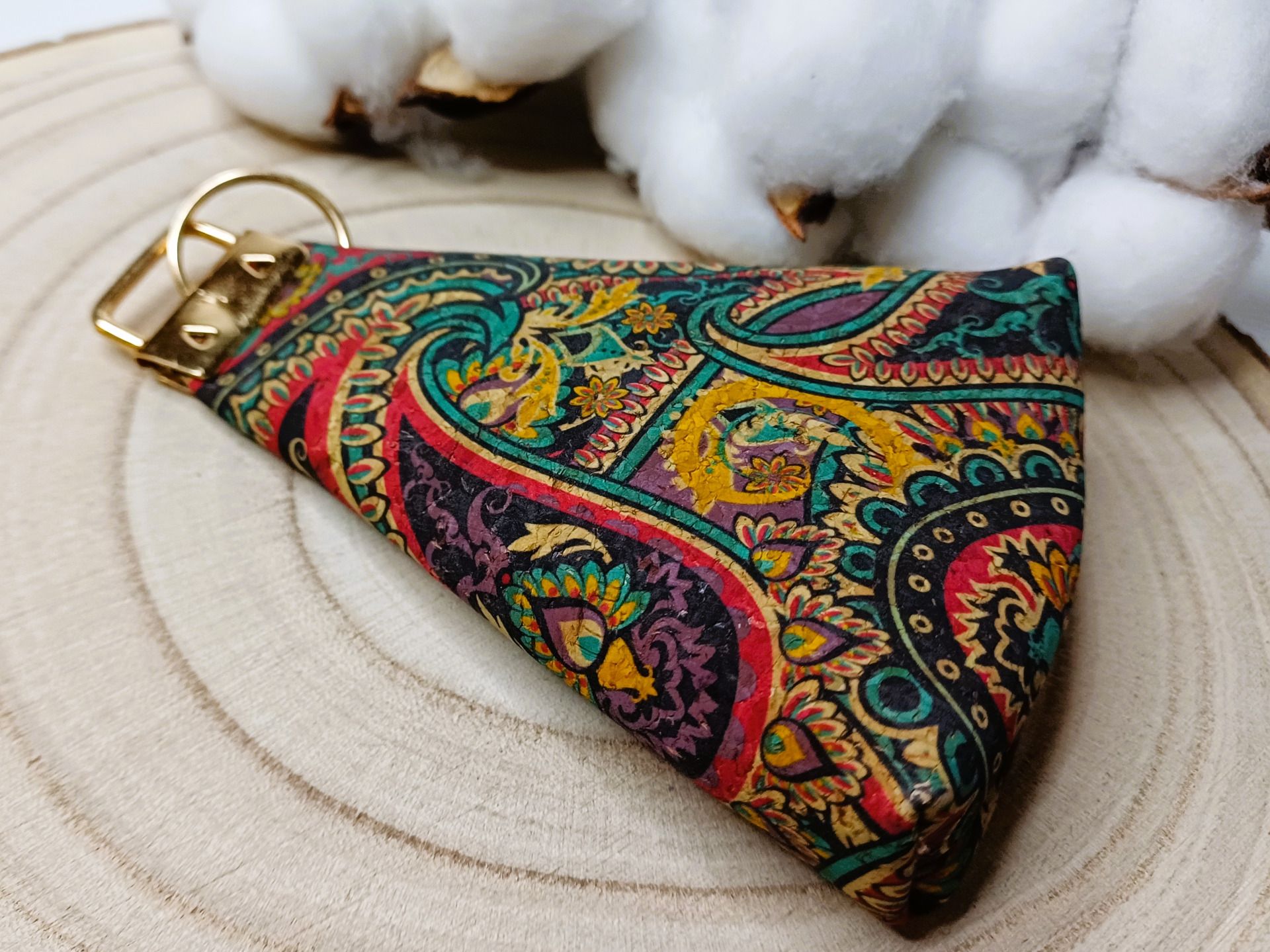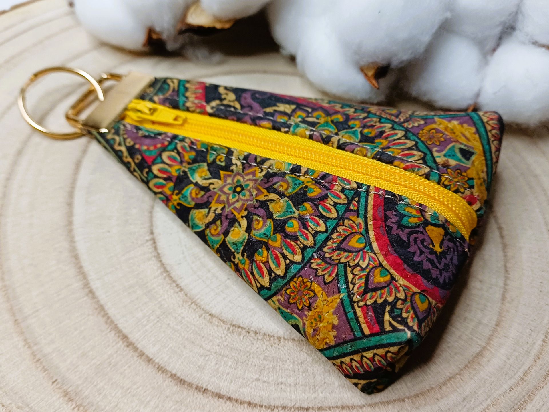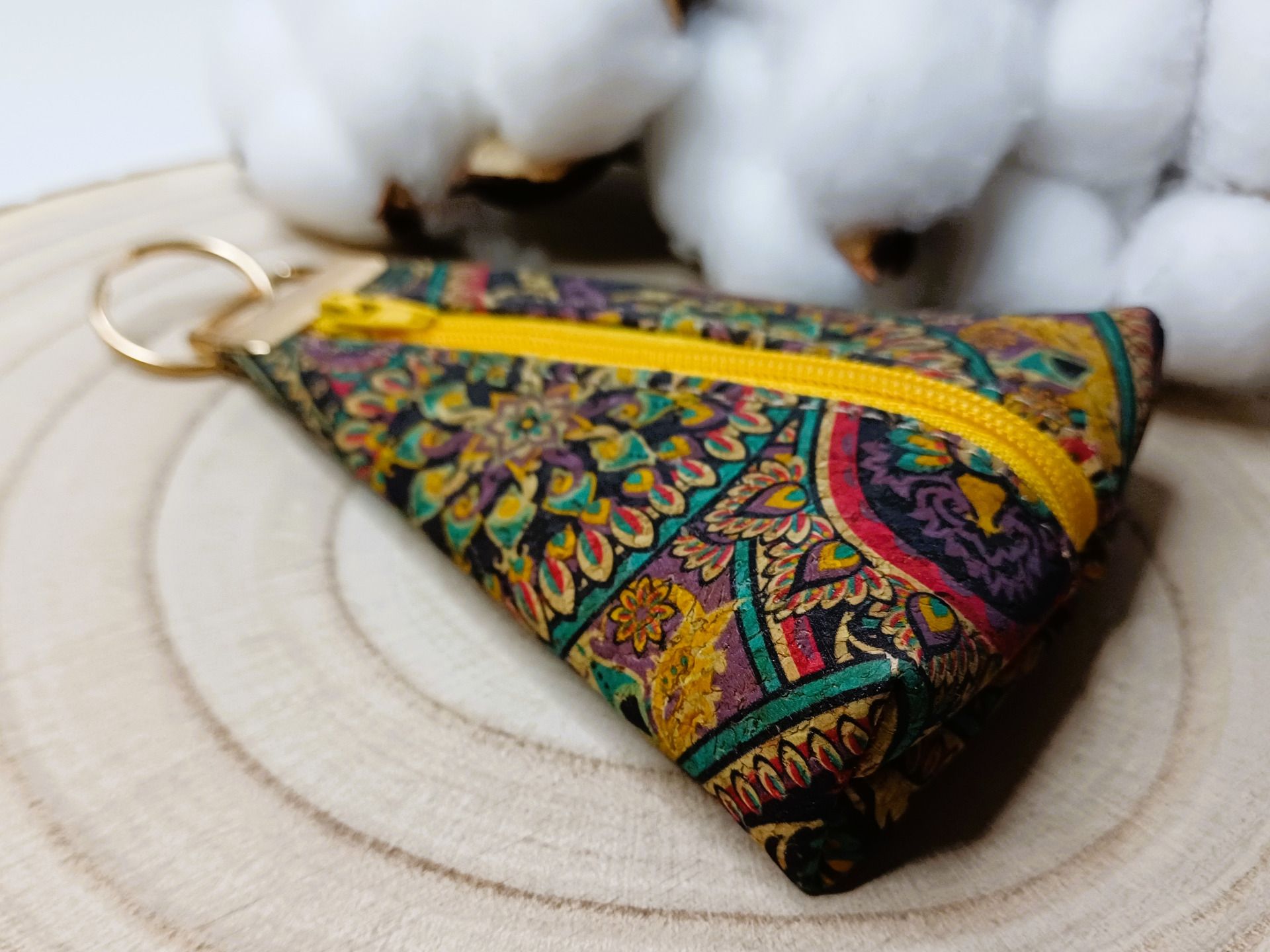 Porte-monnaie qui fait aussi porte-clés en liège avec un motif cachemire jaune.