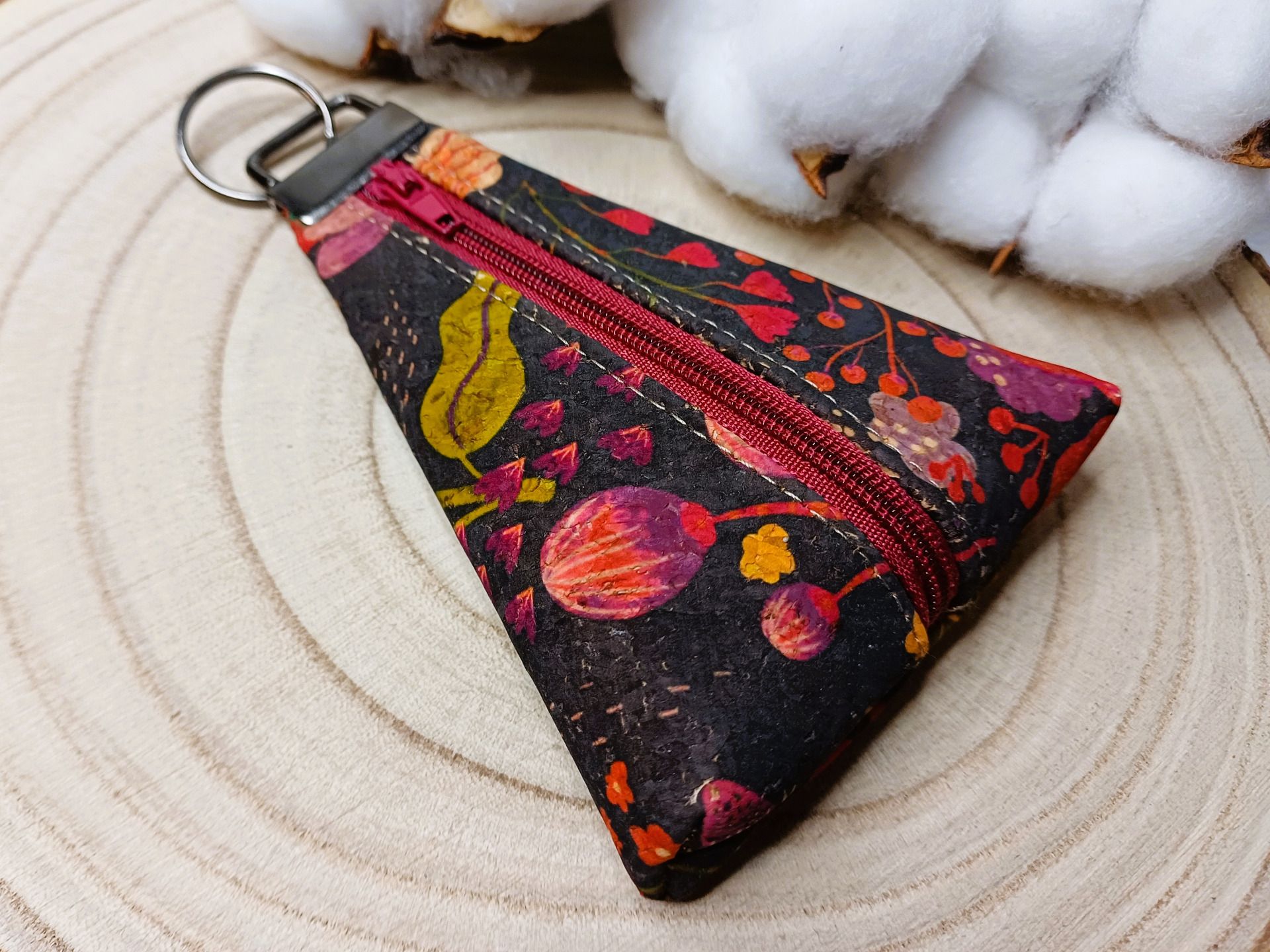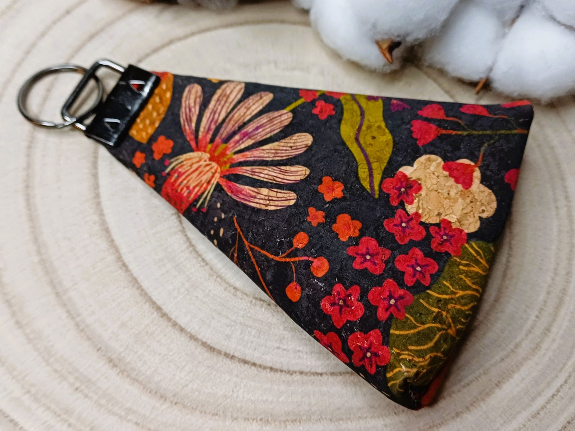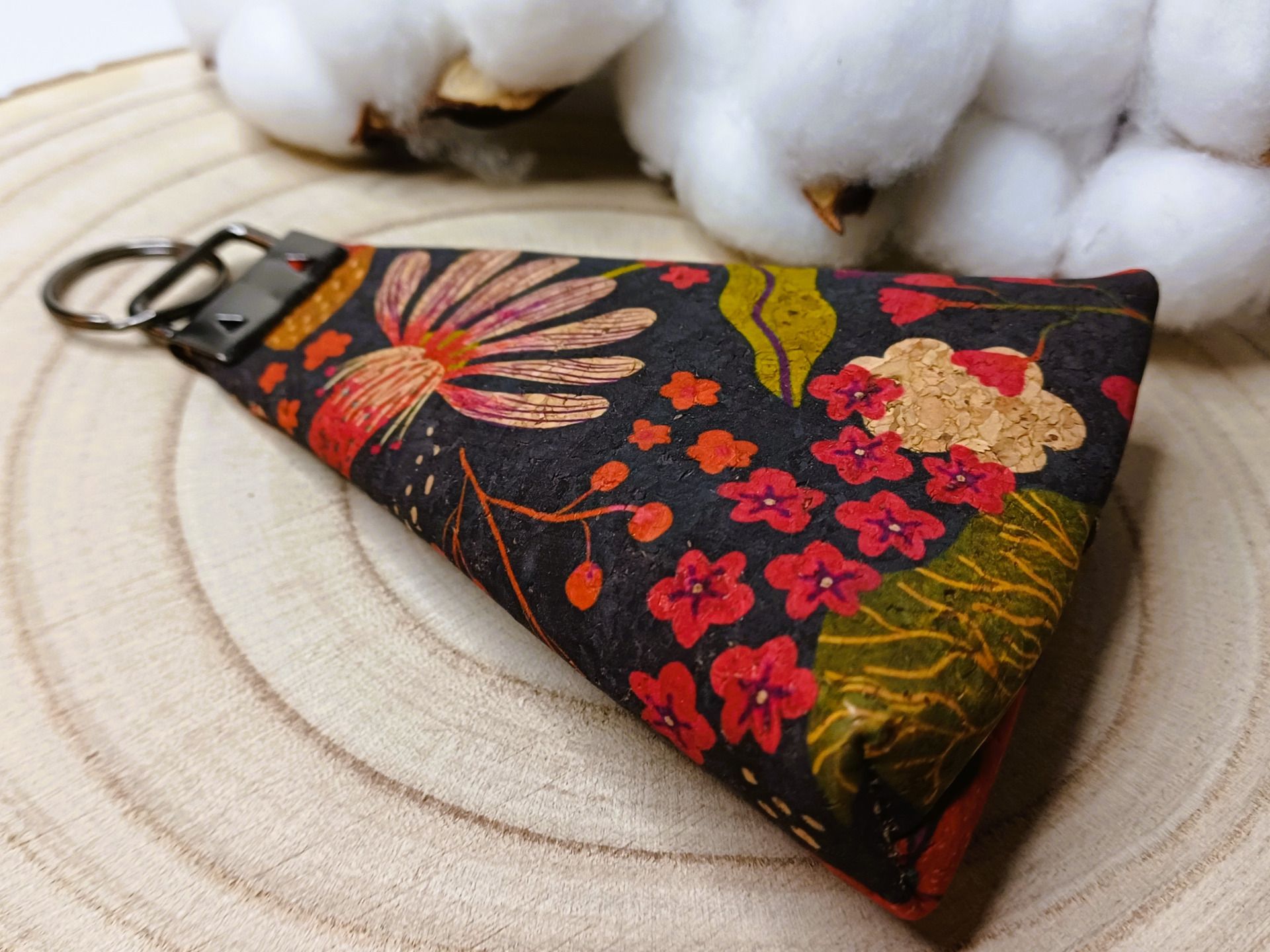 Porte-monnaie qui fait aussi porte-clés en liège avec un motif floral.