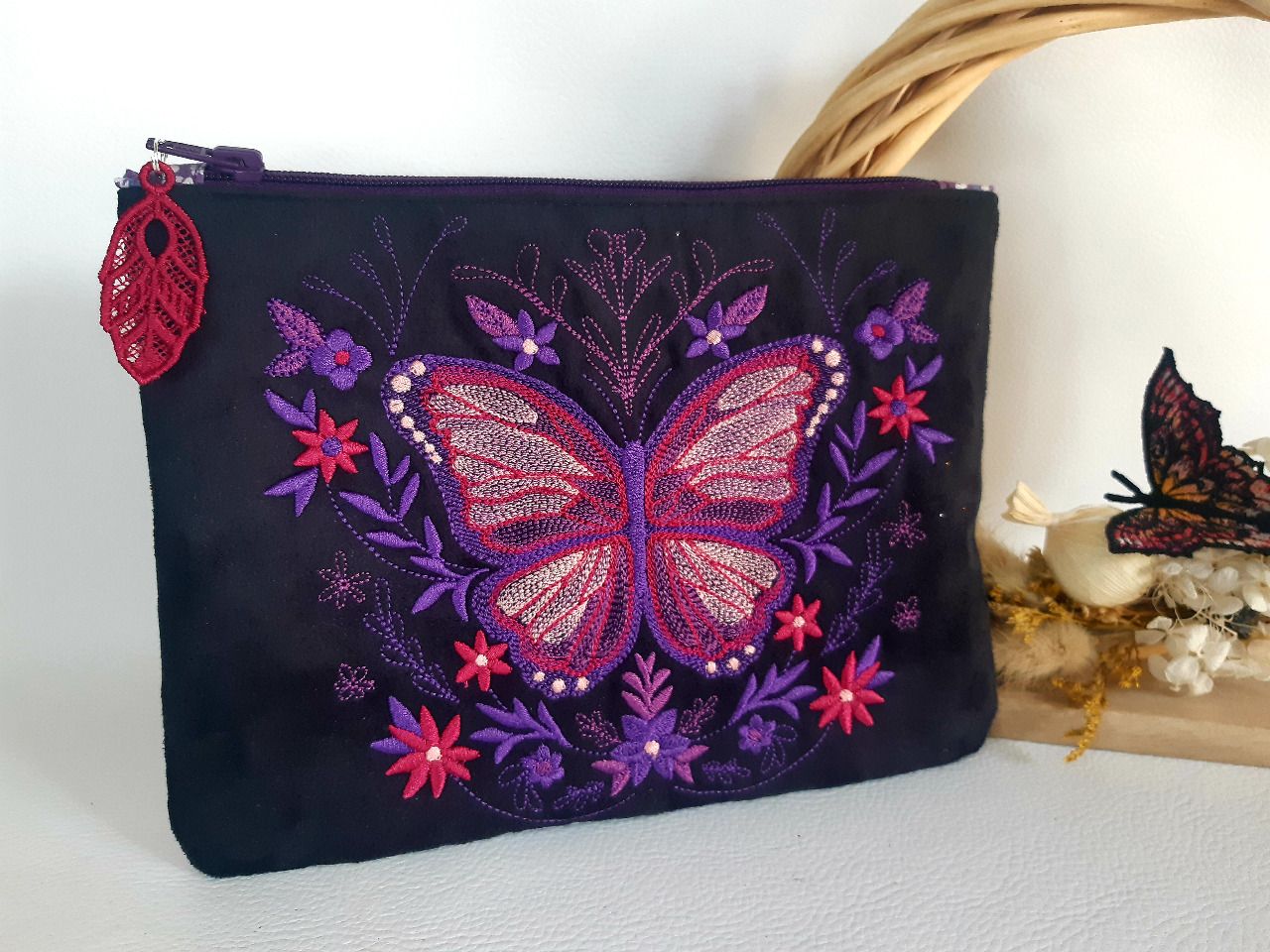 Trousse plate noire avec une superbe broderie de papillon et de fleurs dans des tons fuschia et violet.